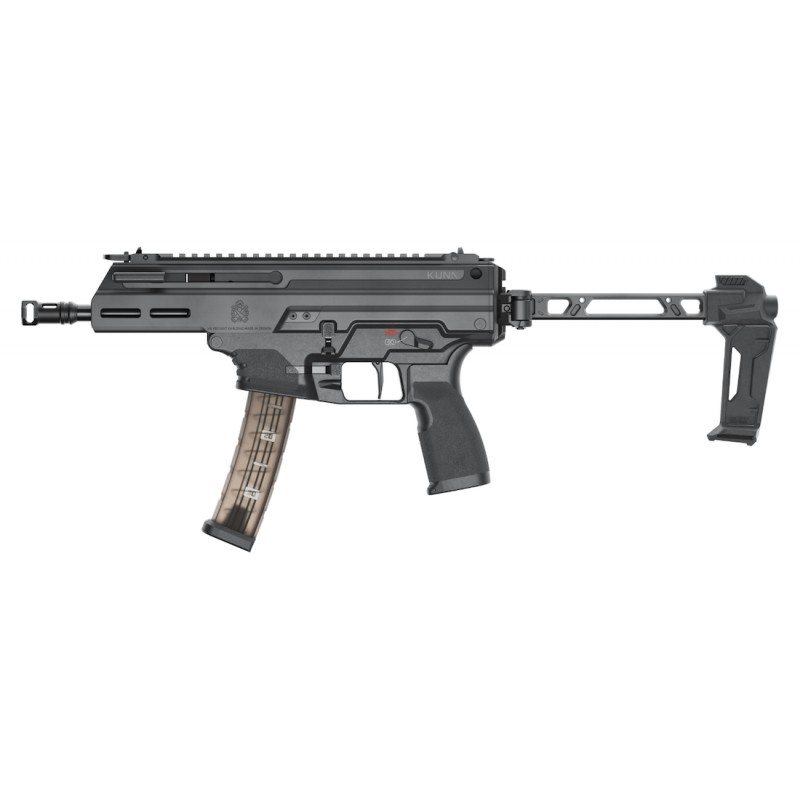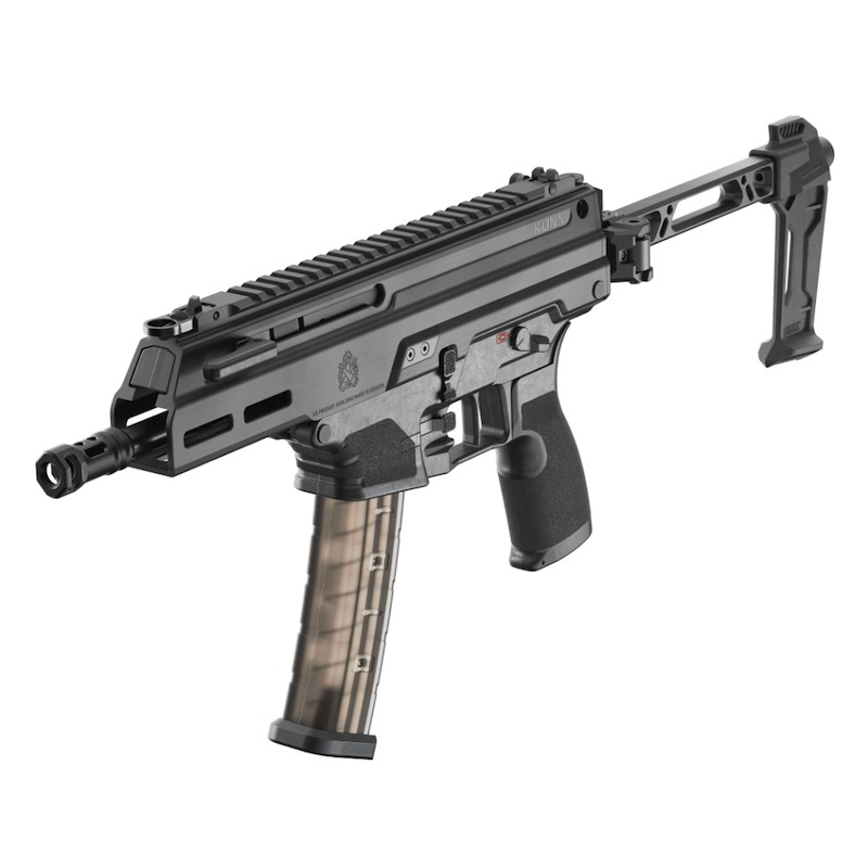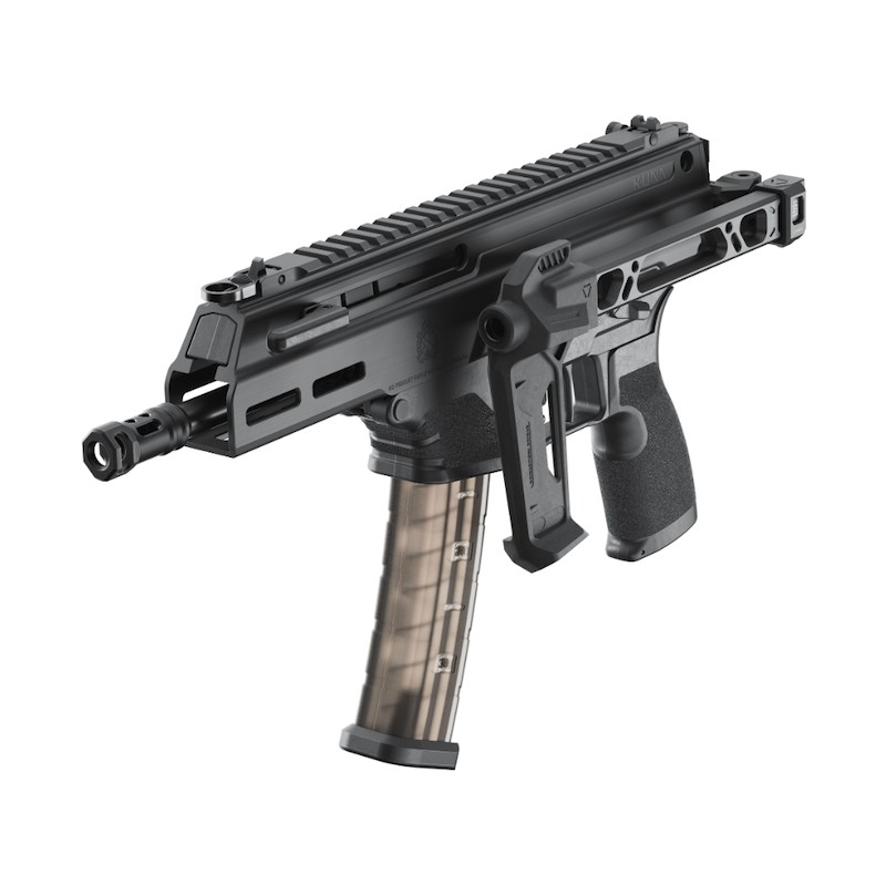 Designed to deliver exceptional shooting stability in a portable package, the Kuna houses a roller-delay operating system that dramatically reduces felt recoil and enhances control. Chambered in 9mm, it features a 6” threaded barrel with a muzzle brake, hybrid flip-up sights, and a 30-round translucent magazine with metal feed lips for reliable operation. Fully ambidextrous controls ensure seamless engagement for any shooter, while the non-reciprocating charging handle keeps handling smooth and unobstructed. The included Strike Industries FSA folding brace is attached to the integrated Picatinny rail end plate further enhancing shooting stability.The roller-delayed operating system uses a locking roller to delay the bolt, allowing for a lighter design that reduces recoil.