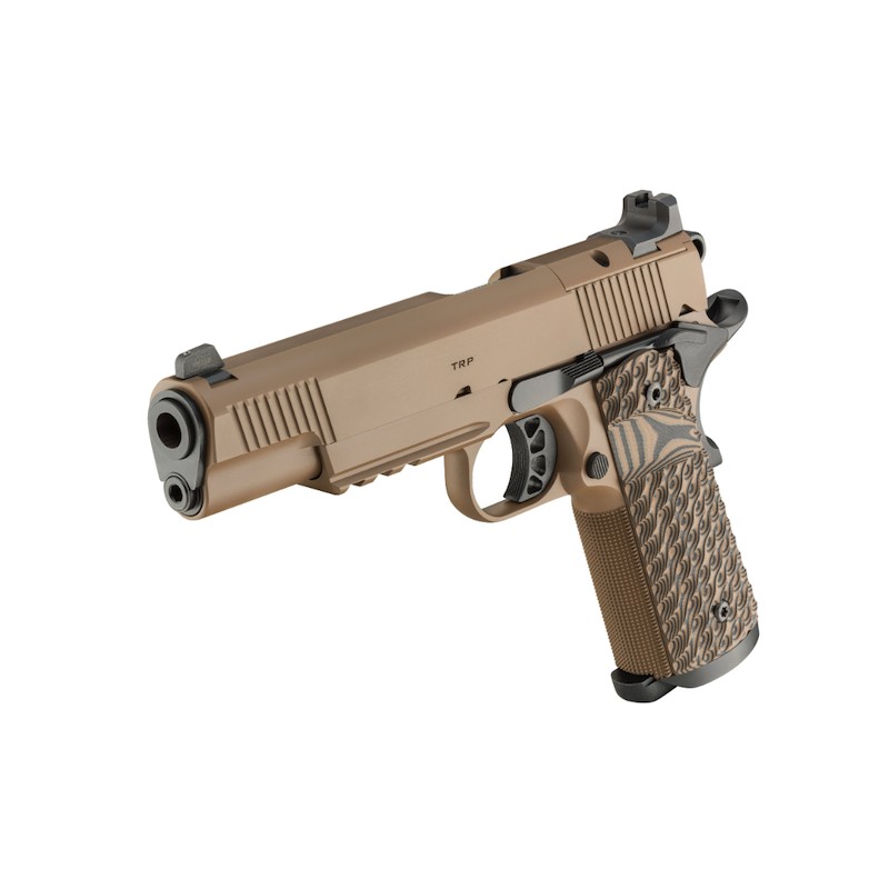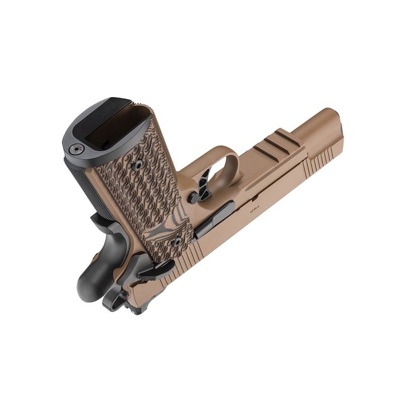 The slim profile of the 1911 TRP™ is now complemented by a lightweight aluminum Carry Contour frame and a 4.25” barrel. Finished in Coyote Brown Cerakote®, the bobbed portion of the frame reduces potential printing while maintaining a comfortable grip. Typically reserved for custom firearms, the TRP features 20 line-per-inch (LPI) checkering for a firm grip as well as top slide serrations for reduced glare and faster sight alignment. Now enhanced with the Agency Optic System (AOS), the TRP supports a wide range of popular optics, including RMR, Shield, Delta Point Pro, and Docter. Each AOS plate integrates a black serrated rear sight that ensures optimal optic height and an intuitive sight picture, enabling visible co-witnessing in nearly all configurations.